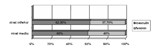 Īn functie de sex, esantionul se distribuie astfel: 29 (38,15%) femei si 47 (61,85%) barbati (figura 2). Īn cadrul lotului de manageri de nivel mediu, femeile sunt īn proportie de 40%, iar barbatii 60%. Lotul de manageri de nivel inferior este format din 37,70 femei si 62,30 barbati (figura 3).