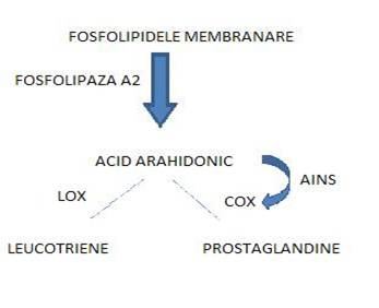 Acidul arahidonic eliberat din fosfolipidele membranare sub influenta fosfolipazei A2 poate fi oxidat de lipooxigenaza (LOX), cu producerea de leucotriene (LT) si de ciclooxigenaza (COX) cu producerea de prostaglandine (PG) (Fig.1).