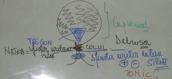 -contractia m detrusor det impingerea urinei spre uretra post, aici se declanseaza alt act reflex-> Stim rec de la uretere -> inf inhib spre motoneuronii din coarnele ant -> ↓ frecv descarcarii de impulsuri in nv rusinosi => se relaxeaza sfinterul uretral extern => incepe mictiunea