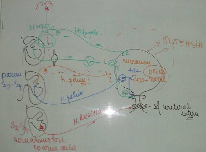 -distensia vezicii urinare ca urmare a acumularii unui vol de urina intre 200 - 400ml, stimul mecanoreceptordin pereti- cale aferenta=fb senz n pelvici->centru Psy sacrat , mictiune -> cale ef -> contr m detrusor