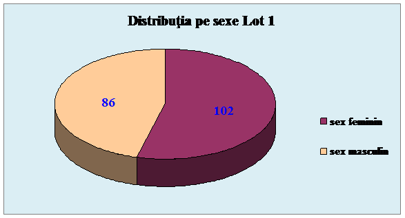 Lotul 1, pacienti care au beneficiat de sedare pentru procedurile diagnostice si terapeutice efectuate, este alcatuit din 188 pacienti, dintre care 102 pacienti de sex feminin si 86 pacienti de sex masculin.