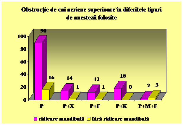 Obstructie de cai aeriene superioare rapid reversibila la manevra de ridicare a mandibulei am constat cu frecventa mai crescuta in cazul anesteziilor combinate Propofol – Opioid – Benzodiazepina (p-value= 0.00958166, chi-square= 13.375, degrees of freedom=4):