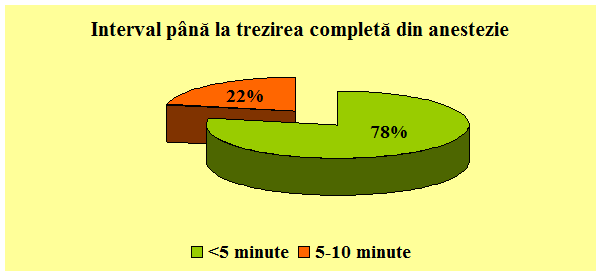 Trezirea din anestezie am inregistrat-o intr-un interval de pana la 5 minute la un numar de 147 pacienti, iar trezire pana la 10 minute la un numar de 41 pacienti.