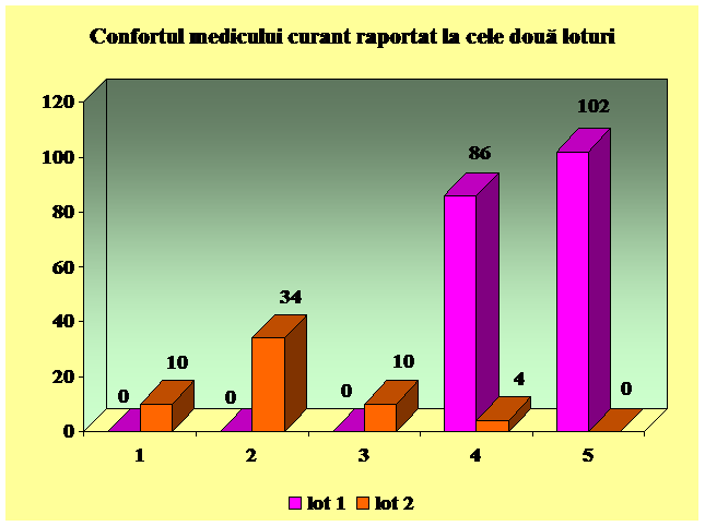 Confortul medicului curant a fost in cazul lotului 1 : 4 la 86 pacienti, 5(maxim) la 102 pacienti, in timp ce la pacientii luati in studiu in lotul 2, am inregistrat valorile: 1 la 10 pacienti, 2 la 34 pacienti, 3 la 10 pacienti, 4 la 4 pacienti.