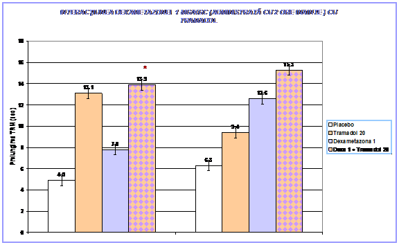 În fig.2 este reprezentata interactiunea Dexametazonei 1mg/kgc administrata cu 2h inainte- cu Tramadolul. Combinatia a realizat o analgezie superioara doar fata de placebo si doar la testarea de la 30 de min., restul rezultatelor fiind nesemnificative fata de placebo sau fata de Tramadolul singular.