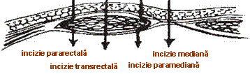 - incizia paramediana (efectuata pe marginea interna a m. drept abdominal, la 2 cm de linia mediana): are avantajul unei incidente mai scazute a eventratiei postoperatorii;