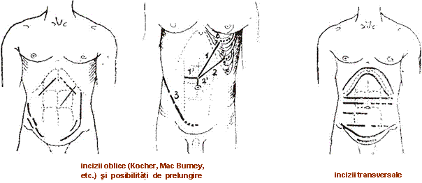 - tipuri de interventii transversale: Sprengel (incizie largita, orizontala), Sanders (in-cizie mediana a aponevrozei, cu disociere sau sectionare transversala a dreptilor), incizie Léclerc "în ogiva" (incizie arcuata subcostala cu concavitate inferioara), incizie Ross (o varianta a precedentei), incizia Pfannenstiel (la nivelul abdomenului inferior, în parul pubian → în interventii ginecologice: caracter estetic, risc minim de eventratie), incizie Bastien (o varianta a precedentei), etc..