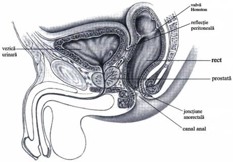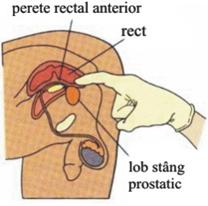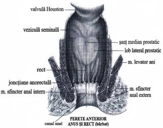 - prin peretele rectal anterior: bulbul penian si uretra membranoasa (mai ales daca exista cateter uretral), prostata (la circa 4 cm de anus) avand in spate veziculele seminale (daca sunt marite de volum), baza vezicii urinare (mai ales daca e destinsa) si, prin intermediul fundului de sac Douglas, eventuale colectii peritoneale sau anse intestinale modificate patologic care bombeaza spre rect;