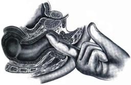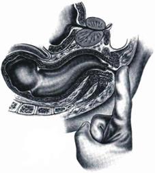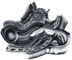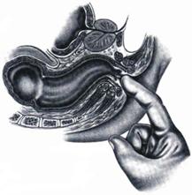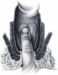 - introducerea blanda a indexului prin canalul anal pana in ampula rectala, cerand bolnavului sa relaxeze aparatul sfincterian (efort de defecatie); se rasuceste indexul exploraor, incercand sa se palpeze circumferential peretele rectal;