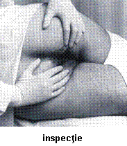 - inspectia regiunii anoperianale, la pacientul situat intr-una din posibilele pozitii de examinare (pozitie Trendelenburg cu membrele inferioare flectate pe trunchi, pozitie genu-pectorala, decubit lateral stang/ drept cu membrele inferioare pe trunchi, decubit dorsal cu membrele inferioare flectate pe trunchi);