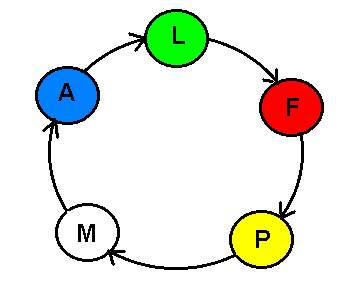 Fiecare element genereaza alt element si de aceea fiecare element este urmat de unul pe care nu il poate stapani. Lemnul este urmat de Foc. Focul este urmat de Pamant. Pamantul este urmat de Metal, etc. Ciclul productiv se desfasoara deci in aceasta ordine: lemn, foc, pamant, metal, apa. Cu alte cuvinte, este un ciclu de generare reciproca aratand interdependenta tuturor lucrurilor din natura. Explicatia acestui ciclu este aceea ca nici un element din natura nu poate domina la nesfarsit. Fiecare element este urmat de unul pe care nu il poate stapani. Semnificatia straveche a acestui ciclu este ca nici un imparat sau dinastie nu poate conduce pe termen nelimitat. Nici un imperiu nu poate dura la infinit. Nimeni nu poate trai de-a pururi pentru ca suntem, cu totii, muritori. Aceasta este Legea Naturii.