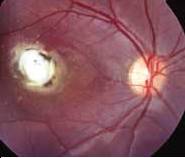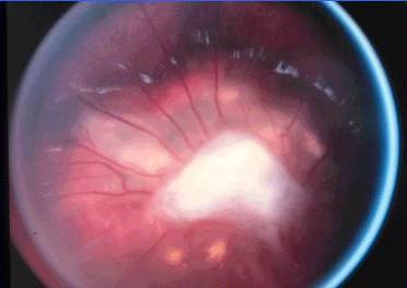 ca o masa retinocoroidata, cel mai adesea in zona maculara. Se