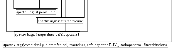 coci si bacili G+; bacili G-; anaerobi (~ metronidazolului); bacili G- (inclusiv piocianic); stafilococi rezistenti, etc.; bacterii G+ si G- aerobe si anaerobe; bacili G- aerobi (de electie); coci G- (Neisseria gonoreae); bacterii G+ aerobe (slab); Micobacterium (strepto, amikacin); coci G+ (streptococ, stafilococ) Mycoplasma, Chlamidia, Rickett- sia, Legionella, Bordetella pertu- sis, unele tulpini de Haemophilus, B.difteric, Moraxella; Helicobacter pilori; Toxoplasma; coci G+ (stafilococ); Neisseria gonorrhoeae; Micobacterium tuberculosis (bk), Chlamidia, Leischmania; spectrul eritromicinei; anaerobi G-; bacterii G+ / G-, aerobe / anaerobe; spirochete, leptospire, actinomices, Micoplasma, Chlamidia, Rickettsia; |