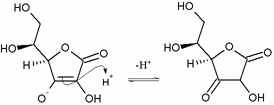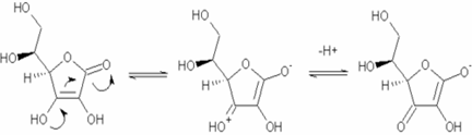 Cei doi hidroxili (-OH) din partea de jos, de la legatura dubla sunt enoli. Un enol pierde o pereche de electroni, devenind o grupare oxoniu (=OH+), prin crearea unei legaturi duble cu atomul de carbon. Simultan, legatura dubla carbon-carbon (dintre enoli) īsi transfera electronii pentru a forma o legatura dubla cu urmatorul carbon. Pentru a face loc, electronii legaturii duble a grupei carbonil sunt primiti de oxigenul carbonilului, pentru a forma un enolat. Oxoniul se deprotoneaza prompt pentru a produce un carbonil, iar aceasta pierdere de protoni da acidului ascorbic caracterul sau acid. Īntreaga reactie este deprotonarea enolului pentru a forma un enolat, unde sarcina negativa a enolatului rezultat este delocalizata de sistemul carbonil (C=O) si de dubla legatura (C=C). Aceasta delocalizare face ionul mult mai stabil si mai putin probabil sa īsi reprimeasca protonul.