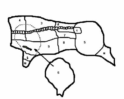 Carne calitate superioara: 5. pulpa; 6. spata;