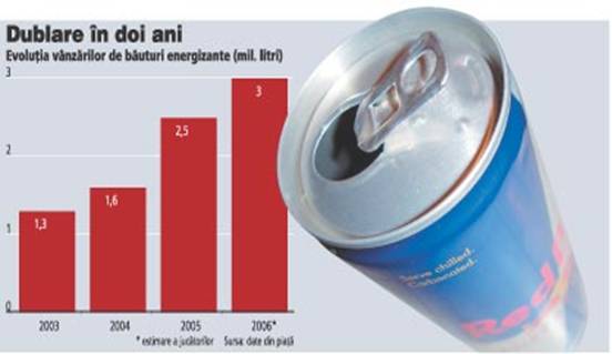 Consumul total pe 2007 de bauturi energizante se va ridica la aproximativ 2,5 milioane de litri. Aceasta in conditiile in care bilantul pe anul trecut a indicat un volum al vinzarilor de aproximativ 1,5 milioane de litri. La nivelul anului 2002, cind piata era de abia la inceput, consumul de bauturi energizante a fost de aproximativ un milion de litri.