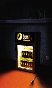 Cel de-al treilea print, FRIGIDERUL, infatiseaza un frigider plin de energie, in ciuda faptului ca e scos din priza. Aceasta energie vine de la numeroasele doze de BURN aflate inauntru.