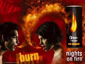 Spre deosebire de piata romaneasca, unde politica de comunicare este una foarte agresiva, privind prin prisma spotului si a printurilor existente, in alte tari din Europa, promovarea BURN si a valorilor marcii este mai domoala, insistandu-se doar pe unul din aspecte; in plus, acest lucru este realizat mult mai subtil.
