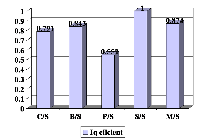 IqC/S =7.697.000/9.030.000(4.7/4.7*0.17+1/1*0.17+14.4/14.4* *0.13+6/6*0.12 + 5/100*0.19 + 9/5*0.22) = (0.17 + 0.17 + 0.13 + 0.12+ 0.10 + 0.39)*0.85= 0.87