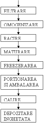 Pregatirea materiei prime conform retetelor aprobate C.I.A. prepararea amestecului in vane cu pereti dubli si agitator, ordinea de introducere a componentelor: lapte, smantana la 60ºC, zahar, lapte praf sau concentrat, stabilizatori, emulgatori. Pasteurizarea la temperature 80-85ºC, 20-30 minute. Preracire la temperature 65-70ºC. Filtrarea: filtru pe sita acoperita cu suport flexibil. Omogenizarea la temperatura 65-70ºC.