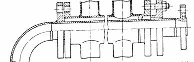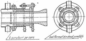 Jocurile dintre tevi sunt etansate de ambele parti cu garnituri, la care si bucsa fixa si bucsa de strāngere se executa din doua jumatati. Ambele jumatati ale fiecarei bucse fixe se sprijina pe patru suruburi introduse īn bosajele mantalei, dupa ce teava a fost introdusa īn manta. Flansele care leaga coturile de tevi au o constructie obisnuita (fig.5).