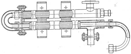 Īn fig.4. este reprezentat un schimbator de caldura "teava īn teava" cu o suprafata de schimb de caldura prevazuta cu nervuri si care se foloseste īn industria petroliera. Pentru marirea compactitatii īn locul īmbinarii cu flanse se folosesc īmbinarile cu nipluri.