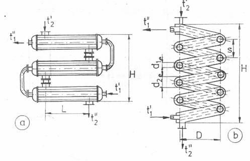 Fig.6. Schema functionala a schimbatorului de caldura tip "teava īn teava" : a- schimbator de caldura tubular; b- schimbator de caldura compact (cu asezarea tevilor īn serpentina); H- īnaltimea schimbatorului; D- diametrul serpentinei; L- lungimea tevilor; S- pasul serpentinei; d2e- diametrul tevii exterioare; d1e- diametrul tevii interioare; (diametre exterioare); t1',t''1- temperaturile, initiala si finala, ale produsului incalzit sau racit;t2', t2''- temperaturile, initiala si finala, ale agentului termic.