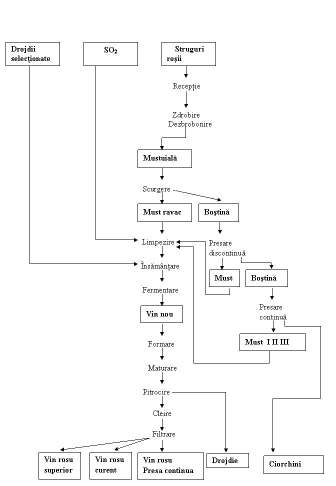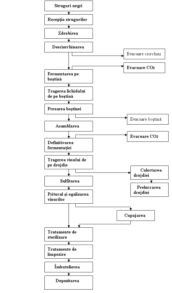 Procesul tehnologic de fabricare a vinului rosu cuprinde urmatoarele operatii: