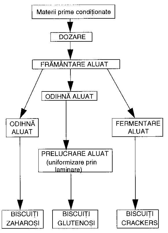 Prepararea aluatului consta din operatii care conduc la inglobarea tuturor componentelor intr-o masa omogena, cu caracteristicile specifice sortimentului de biscuiti care se fabrica. Pentru aceasta sunt necesare operatii de pregatire si dozare a materiilor prime, de framantare si dupa caz de fermentare, apoi de valtuire a aluatului. Pregatirea materiilor utilizate are in vedere aducerea lor intr-o stare fizica, de puritate, de calitate etc., potrivita pentru realizarea unui aluat corespunzator. Pregatirea se face prin dizolvare, separare, sortare, indepartarea componentelor neutile (ex. coji de oua) si altele. Pregatirea materiilor prime asigura aducerea acestora intr-o anumita stare fizica, de puritate, de calitate, pentru realizarea unui aluat corespunzator. Pregatirea se face prin operatii specifice, functie de natura materiei prime si auxiliare. Dozarea materiilor prime se efectueaza in functie de prevederile retetelor de fabricatie si de marimea loturilor. Pentru executarea dozarii se folosesc o serie de aparate de masurare si control. Aceasta operatie se efectueaza in functie de retetele de fabricatie. Dozarea se realizeaza cu ajutorul unor aparate de masura.