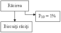 Dupa scoaterea din cuptor, biscuitii sunt raciti de la temperatura de 100 - 120oC pana la temperatura mediului ambiant din sala de fabricatie, de circa 25 - 35oC. Racirea se impune din necesitatea de a le conserva forma si calitatile, deoarece biscuitii calzi sunt greu de manipulat, nu se pot ambala imediat, iar daca pastrarea lor la temperatura ridicata se prelungeste, se accentueaza pierderile. Ca urmare a scaderii umiditatii se favorizeaza descompunerea grasimilor (rancezirea). In timpul racirii biscuitilor, afara de scaderea temperaturii, se modifica si umiditatea. Are loc un proces de repartizare uniforma a umiditatii in masa biscuitului, prin migrarea vaporilor din straturile de la centru spre straturile exterioare. Incheierea acestui schimb de umiditate are loc dupa circa 30 minute si depinde de grosimea biscuitilor si de temperatura, eventual si de viteza aerului de racire. Se recomanda ca in timpul racirii biscuitii sa fie pastrati intr-un spatiu sau zona in care temperatura aerului este de cel mult 30 - 40oC, umiditatea relativa de 70 - 80%, iar viteza aerului de 2,5 m/s, aerul fiind directionat de contracurent cu deplasarea biscuitilor. Modul in care se organizeaza si desfasoara racirea biscuitilor trebuie sa tina seama si de specificul produsului. Deoarece biscuitii zaharosi in stare calda sunt mai plastici si usor deformabili, racirea lor trebuie sa se faca fara a-i supune unor operatii dure, care sa-i degradeze. De asemenea, biscuitii cu dimensiuni mari au o rezistenta mai mica in general si in stare calda in special. In cazul cuptoarelor continue cu coacere pe banda racirea se realizeaza cu ajutorul unei instalatii cu banda care transporta biscuitii. In contact cu aerul salii de fabricatie biscuitii cedeaza caldura si se racesc.