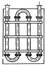 Vasele paralelipipedice au la partea inferioara suprafete de transfer de caldura din teava indoita la 180o intr-un singur rand sau in mai multe randuri suprapuse. Vasele pot avea sau nu agitatoare pentru uniformizarea temperaturii (fig2.4).