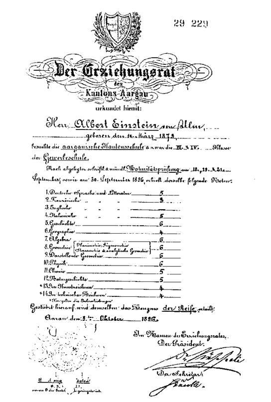 In fine, in toamna lui 1900, Einstein isi va da ultimele examene si va primi o diploma de absolvire, avand o medie generala de 4.91 (nota maxima posibila fiind 6). Notele lui Einstein au fost: fizica teoretica-5, fizica aplicata-5, teoria functiilor matematice-5, astronomie-5, lucrarea de diploma-4.5.