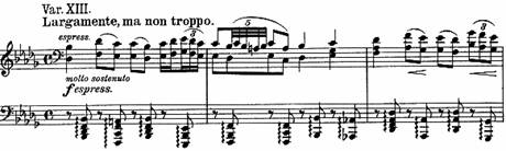 "Largamente, ma non troppo" ("molto sostenuto, espressivo") este o variatiune în si bemol minor. Aceasta pagina, trimite în acelasi timp la nobila sarabanda si la preludiul lent ca un model pentru variatiunea urmatoare. Variatiunea a XIII-a (din nou în minor) este o variatie la omonima si are un aer funebru, îmbinând accente de mars cu intonatii ale folclorului lautaresc maghiar. Caracterul este grav, apasator iar scriitura este în sextet, si armoniile pe contratimp arpegiate în registru grav. Aceasta variatiune reprezinta o combinatie de caractere si prezinta variatii, pentru ca materialul sonor este prelucrat diferit, din aceasta cauza disparând semnele de repetitie. E o variatiune în care articulatiile, sustinerea interioara pe sopran, cuprinderea liniei frazei, cantabilizarea sopranului sunt amanunte esentiale pentru realizarea acesteia.