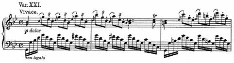 "Vivace" este singura variatiune scrisa în tonalitatea relativei (sol minor). Trioletelor staccato ale mâinii drepte, suprapunerea cu saisprezecimilor de la mâna stânga (leggiero si legato), contureaza o neliniste interioara într-o atmosfera delicata, vaporoasa. Variatiunea XXI îmbina binarul cu ternarul, ca în var. a II-a, cu deosebirea ca este "dolce", nu mai are înflacararea de la început. Este o variatiune nu foarte comoda din punct de vedere pianistic, dar, cred ca atentia atribuita liniei sopranului în timp ce mâna stânga este cântata cât mai leggiero, reprezinta reusita realizarii ei.