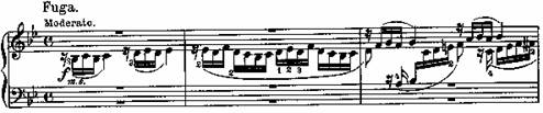 Fuga este tonala, pe 4 voci având un subiect fragmentat, scurt. Este ca un vârf ascutit a temei lui Handel si este enuntata într-o atmosfera solemna. Putem distinge doua caractere diferite în tema. Primul, enuntul propriu zis, ferm, hotarât, solemn, iar al doilea sirul de saisprezecimi mai leggiero si mai redus ca intensitate. Pe acest element (a doua parte a temei) în mp, ne putem fundamenta constructia edificiului sonor în evolutia sa spre culminatie.