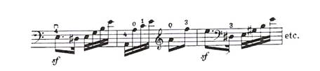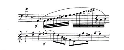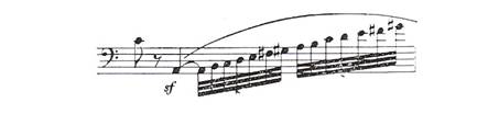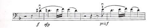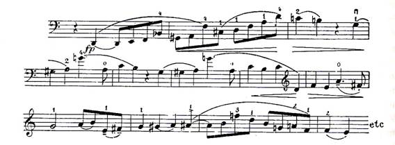 Pâna la dezvoltare, violoncelul executa acorduri desfasurate de re minor, Sol major, triolete executate pe gama Sol major si un pasaj de saisprezecimi.