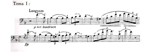 Aceasta tema I expusa de violoncelul solist în piano are un caracter linistit, este simpla dar emotionanta în aceelasi timp, calda si extrem de sensibila, sensibilitatea fiind una din caracteristicile concertului, degajându-se din fiecare pagima a lui. Linistea de început pare sa fie tulburata de arpegiile si gamele ascendente în treizecidoimi, executate de violoncel, fiind pregatite printr-o crestere treptata în intensitate, marcata de nuante- crescendo, forte si sforzando.