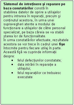 - supravegherea și curățirea zilnică. - reglarea funcționării; - ungere regulată ; - remedierea imediată a defectelor minore. |