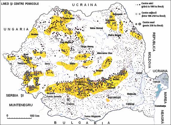 Analizati harta alaturata. Explicati distributia centrelor pomicole de pe teritoriul Romaniei.