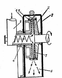 6-dispozitiv pneumatic, cu piston, pentru presarea sulului de hârtie pe suprafata tobei; 7-jgheab de tabla.