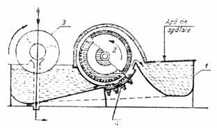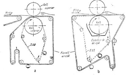 A-cu functionare în contracurent; b-cu functionare în echicurent; 1-flanela; 2-sita; 3-cutie de alimentare; 4 14514l1116o -valt de preluare; 5-preaplin;6-cuva; 7-valt perforat.