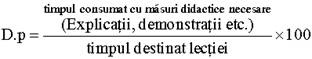 1. Densitatea pedagogica este data de raportul dintre timpul folosit in mod util pentru rezolvarea tuturor momentelor didactice necesare desfasurarii lectiei si durata integrala a acesteia. Ea include timpul afectat demonstratiei, explicatiei, prezentarii materialului intuitiv, indicatiilor metodice, organizarii colectivului, organizarii materialelor didactice si odihnei elevului. Densitatea pedagogica se calculeaza dupa urmatoarea formula: