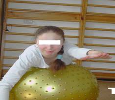 eleva, A.M 16 ani cu o scolioza, care face un exercitiu pe o minge Bobath īntr-o sala de kinetoterapie.