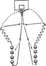 Jucatorii sunt impartiti in doua echipe egale si sunt asezati pe siruri in colturile opuse ale terenului de baschet inapoia unei linii. Primul jucator de la fiecare echipa are o minge. La semnal, jucatorii cu mingea pornesc fiecare spre terenul din fata lui in dribling , ajungand in apropierea cosului, trag la cos, culeg mingea, se intorc in dribling pana la linia de centru de unde paseaza jucatorului urmator din echipa sa, care continua jocul, iar el trece la coada sirului.