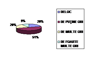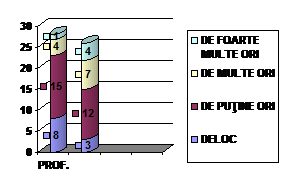 Putem constata ca peste jumatate din esantion au avut activitati in care au implicat comunitatea de putine ori si doar 9% dintre cei chestionati nu au avut nici o astfel de activitate. Si aici vom face o diferentiere intre profesori si invatatori din care vom constata ca predominant invatatorii au astfel de activitati didactice fapt din care putem observa ca implicarea parintilor la clasele mici in cadrul actului educativ este mai mare decat la gimnaziu.