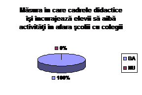Se poate observa ca in totalitate cadrele didactice manifesta disponibilitatea de a-si incuraja elevii sa aiba activitati in afara scolii impreuna cu colegii de clasa iar cea mai mare parte dintre subiecti cunosc conditiile in care elevii traiesc: