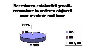 Itemul care concluzioneaza intregul chestionar aplicat face referire la necesitatea colaborarii scoala-comunitate. Raspunsurile se pot interpreta dupa cum urmeaza: