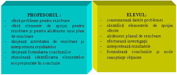 Practic, in problematizare se rezolva probleme sau situatii problema, se valorifica experienta anterioara a elevului, se restructureaza/completeaza fondul de cunostinte si se folosesc resursele proprii ale elevilor pentru rezolvare.