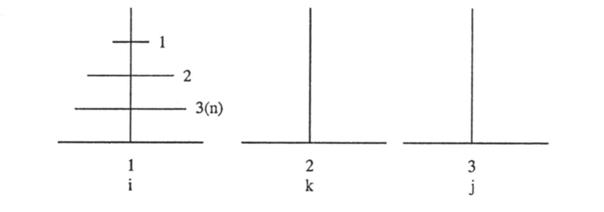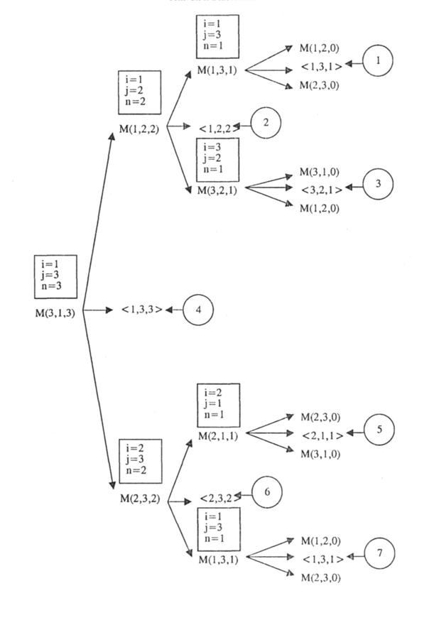 Procesul se termina si se obtine solutia finala doar în momentul când stiva redevine goala, în exemplul detaliat de mai jos, consideram cazul i = 1, j = 3, k = 2, n = 3. Ceea ce se gaseste în finul, ca succesiune de mutari, este :