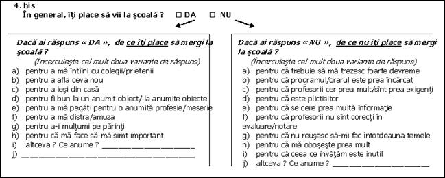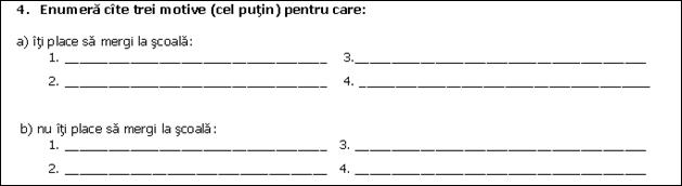 Pornind de la descrierea succinta a celor patru factori prezentati mai sus, pe o coala de hartie A4, va rugam sa realizati un tabel cu patru coloane, cate o colana pentru fiecare din acesti factori. Gandindu-va la elevii din clasa dumneavoastra preferata va rugam sa estimati carei categorii apartine fiecare si sa treceti fiecare nume in coloana corespunzatoare. Rugati unul sau cativa dintre colegii dumneavoastra sa faca acelasi lucru si apoi comparati rezultatele obtinute. Pregatiti-va sa argumentati alegerea dumneavoastra pentru situatiile in care apar neconcordante intre estimarile facute de dumneavoastra si cele ale colegilor. Dupa ce ati negociat pozitia fiecarui elev, definiti o strategie de motivare diferentiata. Comparati datele obtinute in aceasta etapa cu cele obtinute in aplicati precedenta. Analizand pozitiile elevilor si strategiile de lucru pe care tocmai le-ati definit, care sunt principalele concluzii cere le-ati putea formula? O alta modalitate de a afla ce anume ii motiveaza pe elevi este aceea de a intreba elevii, in cadrul unor micro-anchete. In exemplu de mai jos va oferim atat un model de intrebare deschisa cat si un model de intrebare cu raspunsuri prestabilite (rezultate de regula din sistematizarea unor raspunsuri obtinute prin punerea unei intrebari deschise). Pentru a culege informatii relevate privind motivatia elevilor, puteti modifica aceasta intrebare in functie de specificul activitatii dumneavoastra sau puteti construi alte intrebari.